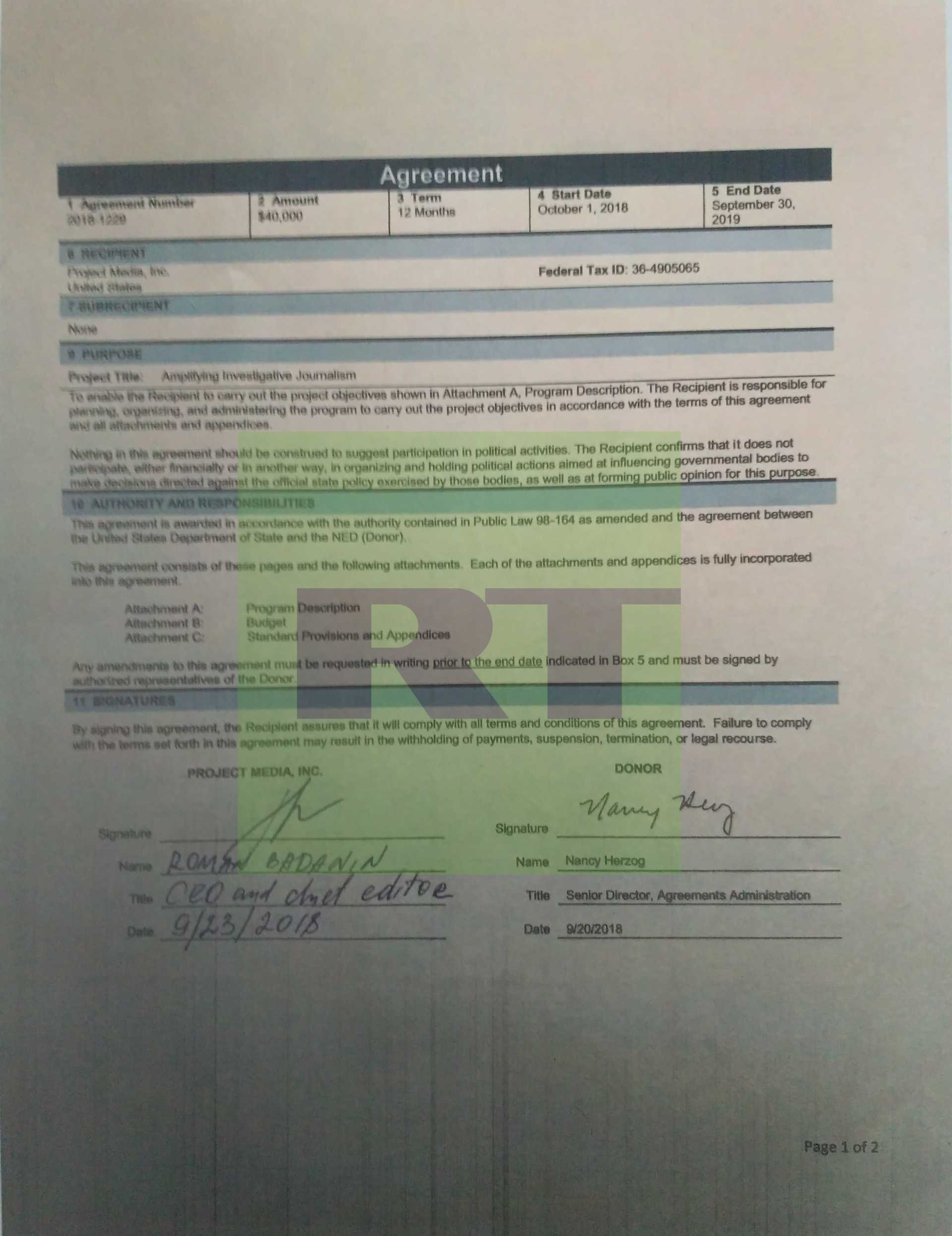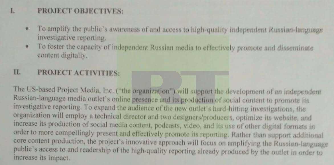Согласно всем этим данным, соглашение с NED о получении гранта подписано сентябрём 2018 года, а первый транш прошёл в октябре. Деньги выдавали с целью «расширить доступ русскоязычной аудитории к высококачественным независимым расследованиям», следует из приложения к соглашению с NED. Также грантодатель рассчитывал на «развитие способности независимых российских СМИ эффективно продвигать и распространять контент в цифровом формате».