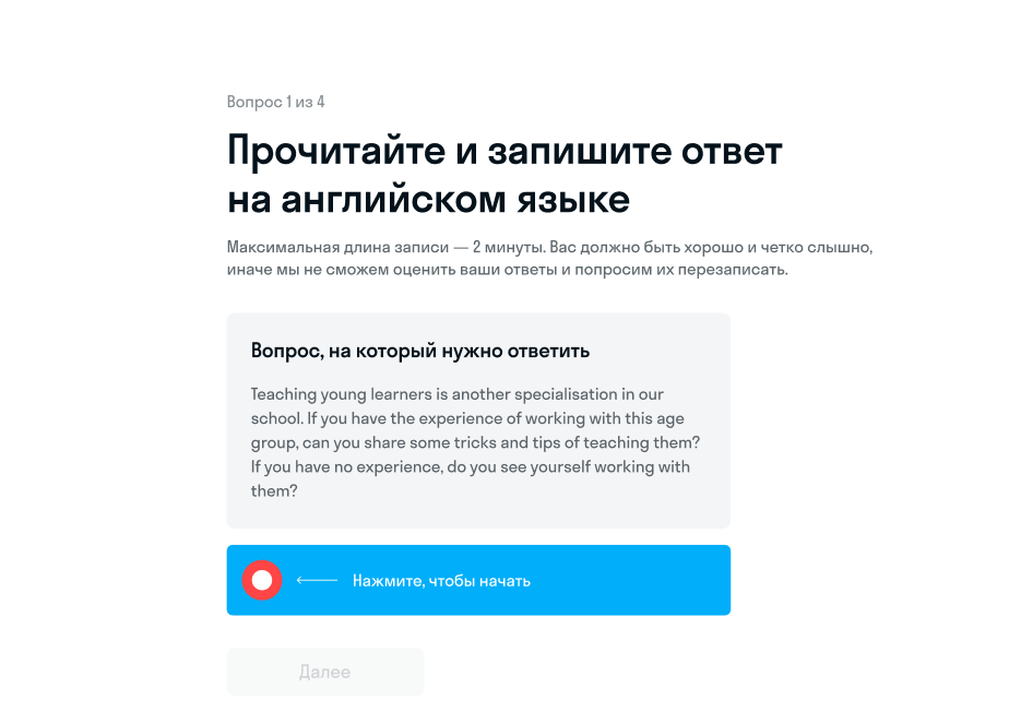 Аудиоинтервью в Skyeng — это 3 вопроса на английском языке и 1 вопрос на русском. Многочасовых монологов не будет: нам достаточно, чтобы каждое из четырех аудио было длиной до двух минут. Итого — вы будете говорить не дольше 8 минут.