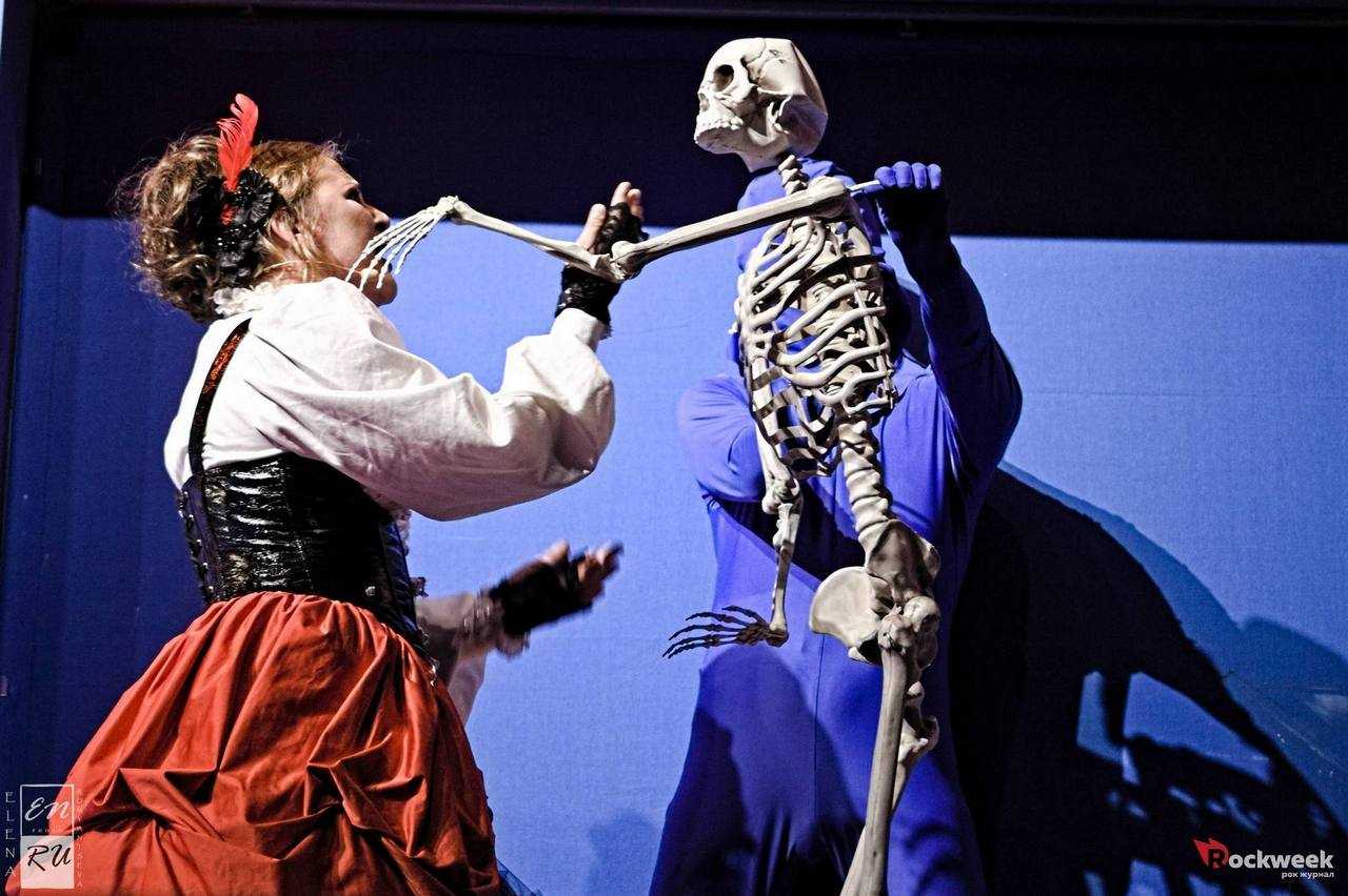 Так, например, в какой-то момент на сцене внезапно появился скелет, обнимающий Ловетт своей костлявой рукой. Движениями скелета руководил человек в синем трико, практически сливающийся с фоном. Таких синих человечков в разные моменты на сцене побывало достаточно, и это смотрелось интересно и необычно.