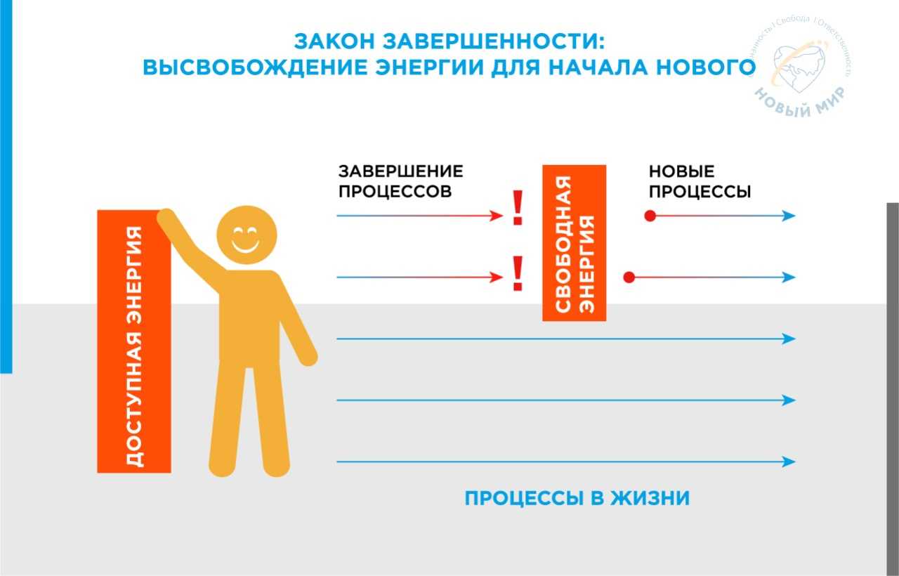 Для взаимодействия необходима энергия. Поэтому окончание каждого процесса всегда высвобождает энергию. Очень часто ты попросту не можешь начать ничего нового в жизни, поскольку у тебя нет свободной энергии. Вся твоя энергия поглощена теми процессами, в которых ты уже участвуешь.