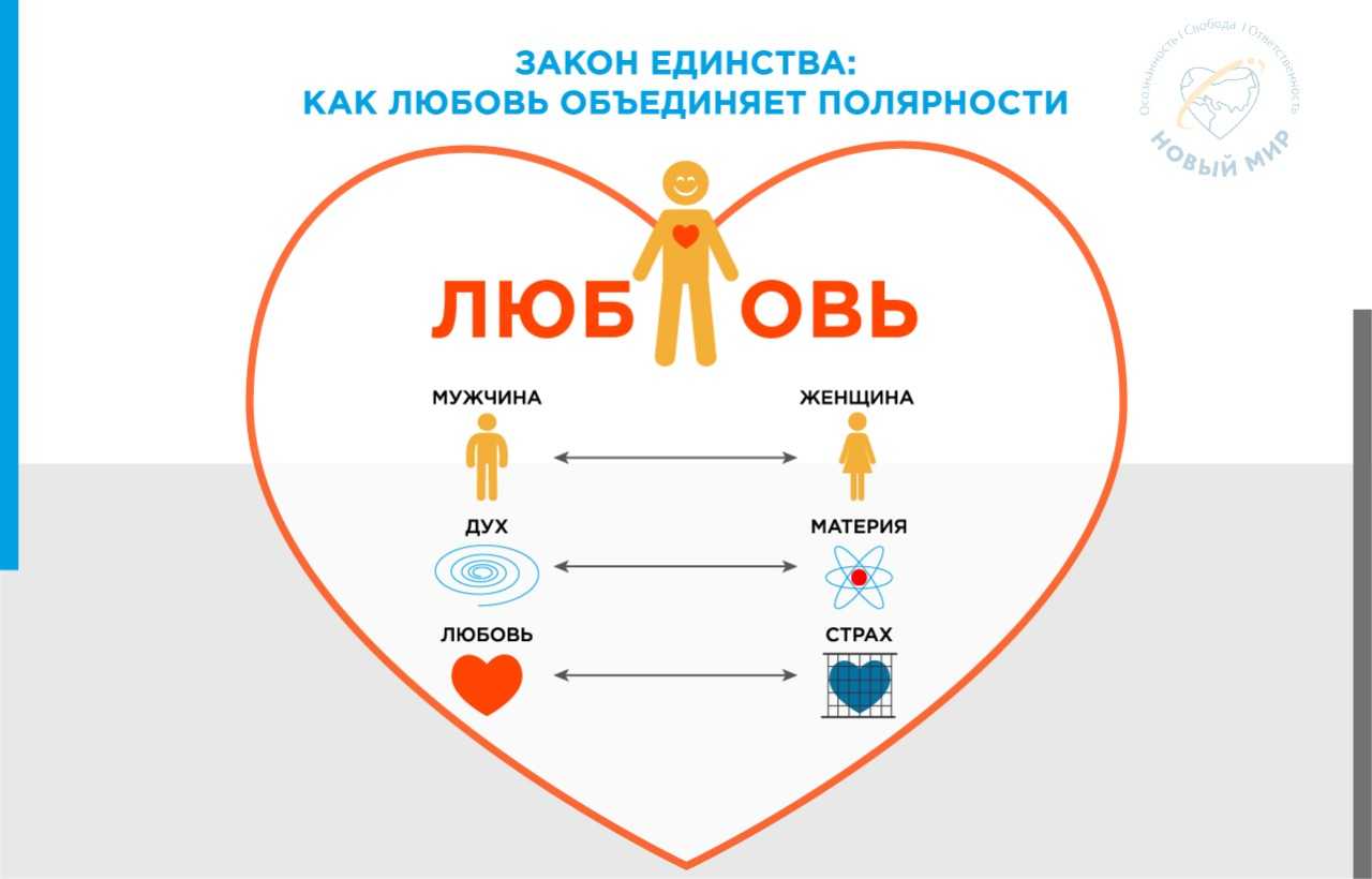 Казалось бы, на первый взгляд, закон Единства противоречит закону Полярности. Однако, это совершенно не так. Полюса по-прежнему существуют… Просто именно Любовь позволяет объединить противоположные начала. Сила Любви прекращает борьбу и противопоставление, характерные для дуального взгляда на мир. Она позволяет ощутить подлинное, глубинное единство противоположностей, у которых один источник – Абсолют.