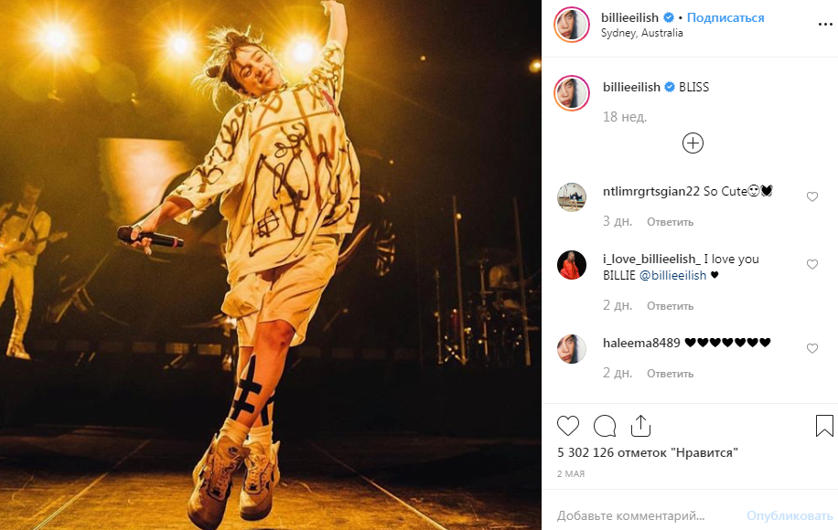«Живые» выступления девушки – яркие представления с огромным количеством впечатляющих спецэффектов. Она ведет себя на концертах так непринужденно, что зрителям кажется – это не всемирно известная уже артистка, а их подружка! Айлиш говорит: «Все, кто приходит ко мне на шоу – могут считать себя моими друзьями».