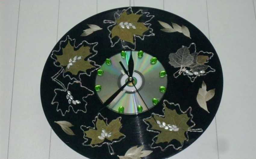 Один из самых оригинальных способов использования старых виниловых пластинок. Работа кропотливая, но творческая. Итак, для начала пластинку следует подготовить. Для этого вымыв, сняв этикетку, и высушив, пластинку покрывают акриловой краской для грунтовки. Дав грунту высохнуть, следующим этапом наносится фон и производится декорирование диска. Тут помогут фантазия и творческие способности. Это может быть картина краской, выжигание или резка по винилу. Очень интересно смотрится комбинация этих способов оформления. Последним этапом идет закрепление часового механизма, который предварительно следует подготовить, сняв с каких либо старых неиспользуемых часов. Идеально подходит механизм от часов, работающих на пальчиковых батарейках. Последний штрих циферблат, который наносится, как правило, по шаблону, стиль оформления циферблата зависит только от фантазии автора.