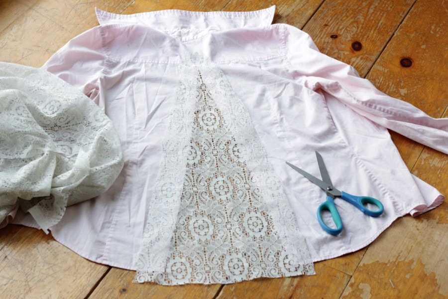 Чтобы самостоятельно сделать такую вещь, подготавливаем рубашку, кружево, булавки, ножницы и нитки. Вместо кружева можно использовать ненужную скатерть или занавески.
