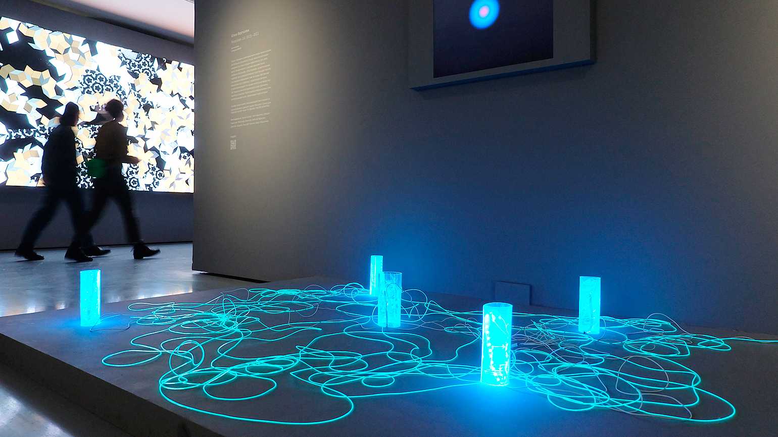 Рассказать об этой выставке в одной статье невозможно: художники исследуют связь живого мира и неживого, привлекают к работе учёных, работают со звуком, светом, погружают зрителя в цифровую реальность и рисуют будущее карандашом. Поскольку большинство работ не вписываются в общепринятые представления о прекрасном и часто непонятны, то, планируя поход, запаситесь временем — придётся прочесть много подписей. Именно они помогут раскрыть замысел и полностью погрузиться в искусство новой эпохи.