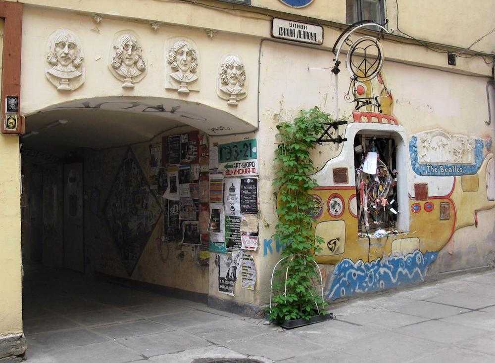 Одно из самых интересных арт-пространств Санкт-Петербурга. Арт-центр «Пушкинская 10» начал свое существование в 1989 году, когда в заброшенном доме на этой улице начали собираться независимые художники, музыканты и прочие деятели искусства. Так и появился культурный центр, на территории которого впоследствии работали такие известные личности, как Тимур Новиков и Борис Гребенщиков. Арт-центр успешно функционирует до сих пор, сейчас здесь проводятся концерты и выставки современных художников. Также здесь находится знаменитая улица Джона Леннона.