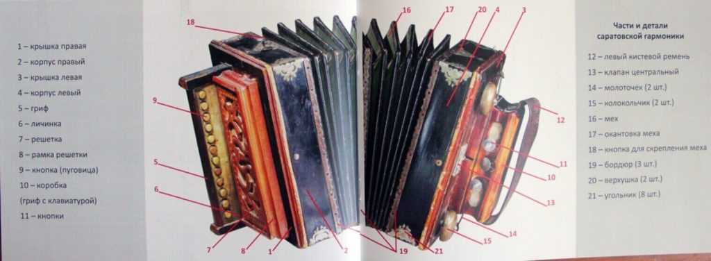Сам инструмент делится на два полукорпуса: правый и левый. Между ними находится так называемый мех;