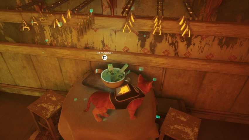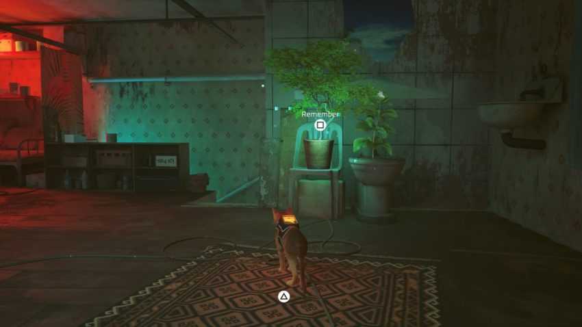 От Стража пройдите мимо бара и продолжайте идти по дорожке, пока не дойдете до красной двери. Царапайте дверь, пока робот не ответит. Войдите внутрь и поднимитесь по лестнице. Память — это растение на стуле.