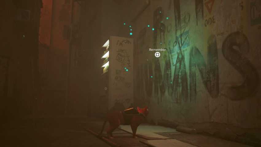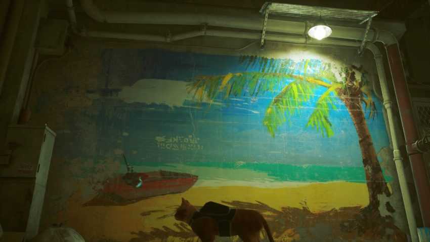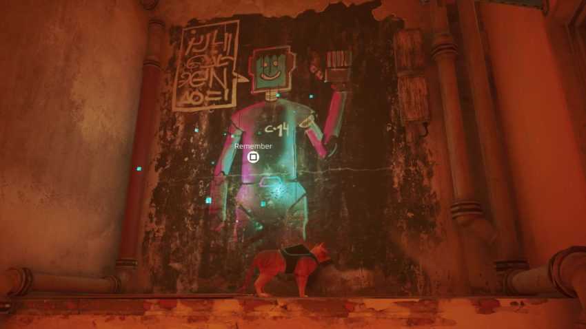 После достигнув трущоб и пообщавшись со Стражем, вам будет разрешено бродить. Спускайтесь по лестнице от Guardian туда, где находится музыкант по имени Morusque. Спуститесь по переулку и заберитесь наверх, используя кондиционеры и навесы, чтобы найти фреску с изображением машущего робота.