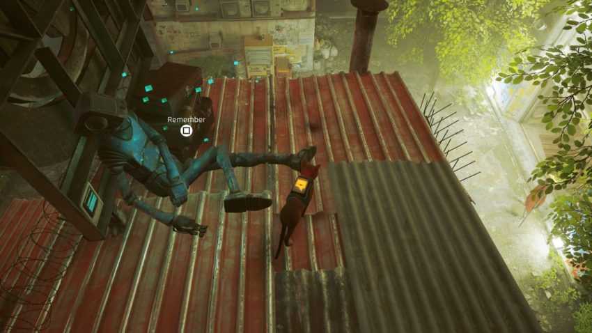 Посмотрите прямо над Стражем. Используйте вентиляционные отверстия и трубы, чтобы добраться до крыши, чтобы найти мертвого робота рядом с кучей чемоданов. В эту область можно легко попасть, следуя по тропинке напротив того места, где находится торговец.