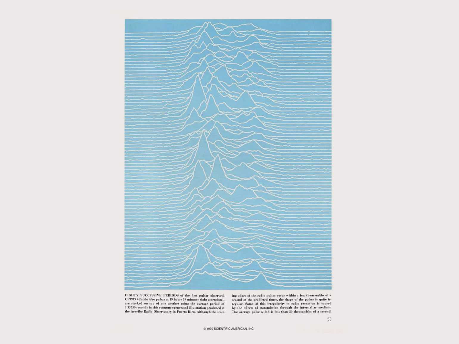 Была и ещё более ранняя публикация графика. Волны на голубом фоне появились к статье «Природа пульсаров», вышедшей в январе 1971 года. И снова без ссылки на автора.