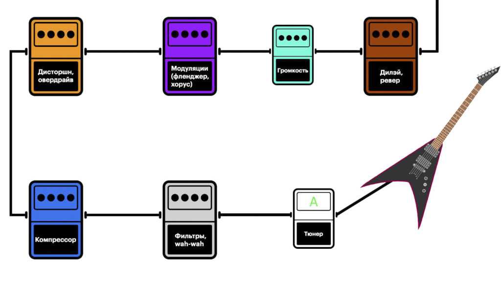 Электрогитара >> тюнер >> звуковысотные фильтры >> компрессор >> тоновые эффекты >> модуляция >> педаль громкости >> временные эффекты >> усилитель.