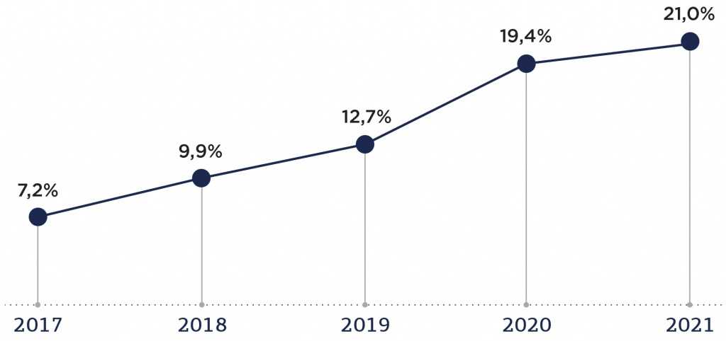 Последние 5 лет наблюдается лишь положительная динамика: процент продаж, совершаемых онлайн, стабильно растет. В 2021 году 21% продаж в fashion-сегменте был совершен в Интернете. Темп развития онлайн-торговли в прошлом году сопоставим с показателями 2020 года, когда покупатели массово стали переходить в Интернет из-за коронавирусных ограничений.