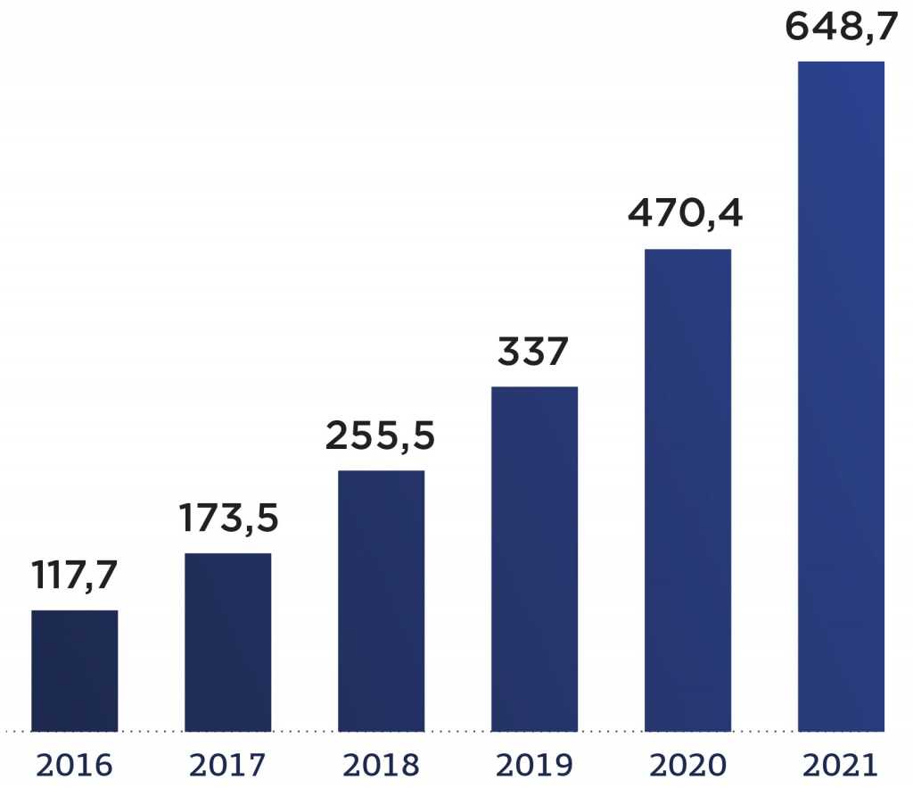 К тому же fashion-ритейл – один из самых динамичных сегментов онлайн-торговли в России. Стабильно с 2016 года объем fashion-рынка увеличивался хотя бы на 30% в год. По сравнению с 2020 годом рост составил 37,9%: было продано товаров на 648,7 млрд рублей, что на 178,3 млрд больше объемов предыдущего года.