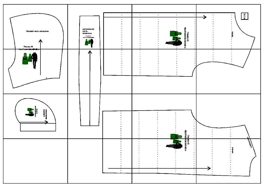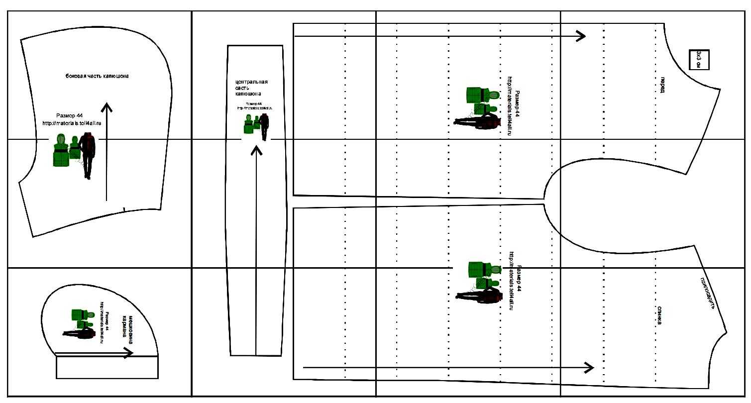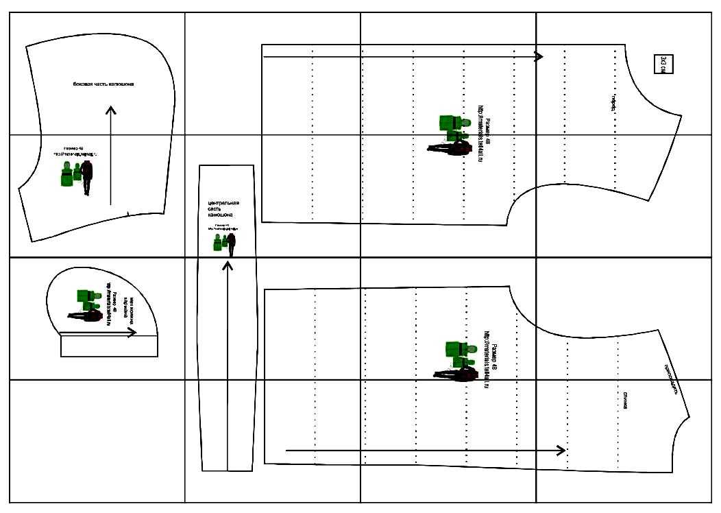 Раскладка лекал на материале для маленьких размеров — см. ниже.