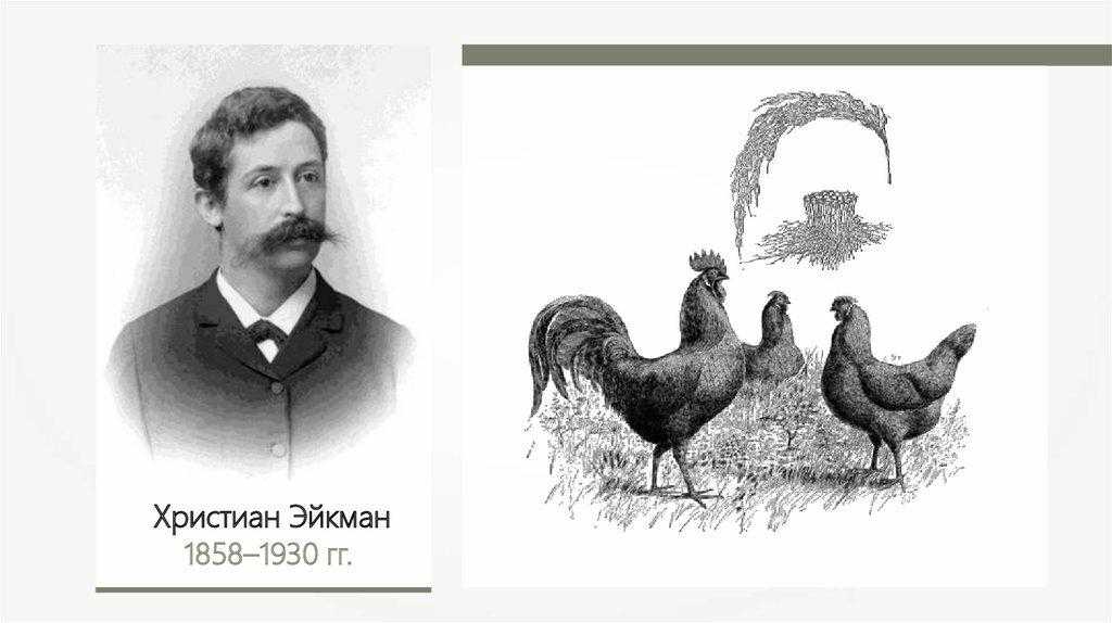 В то же время, а конкретно в 1897 году, Христиан Эйкман наблюдал то же заболевание, но у домашних птиц. Экспериментальным путем голландский врач установил, что болезнь прогрессирует, если кормить птиц очищенным белым рисом, и регрессирует, когда птицам дают черное неочищенное зерно. Из этих исследований был сделан вывод: в рисовых отрубях находится важный для здоровья и жизнедеятельности элемент.