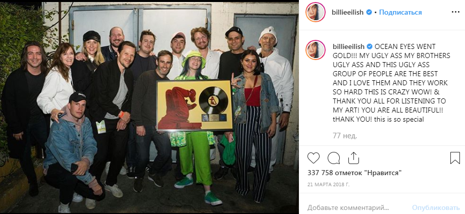- Как и многие современные певцы, Айлиш начала в SoundCloud. Там она выпустила такие песни, как: sHE’s brOKen, Fingers Crossed и хит-сингл Ocean Eyes. И это в возрасте 14 лет.