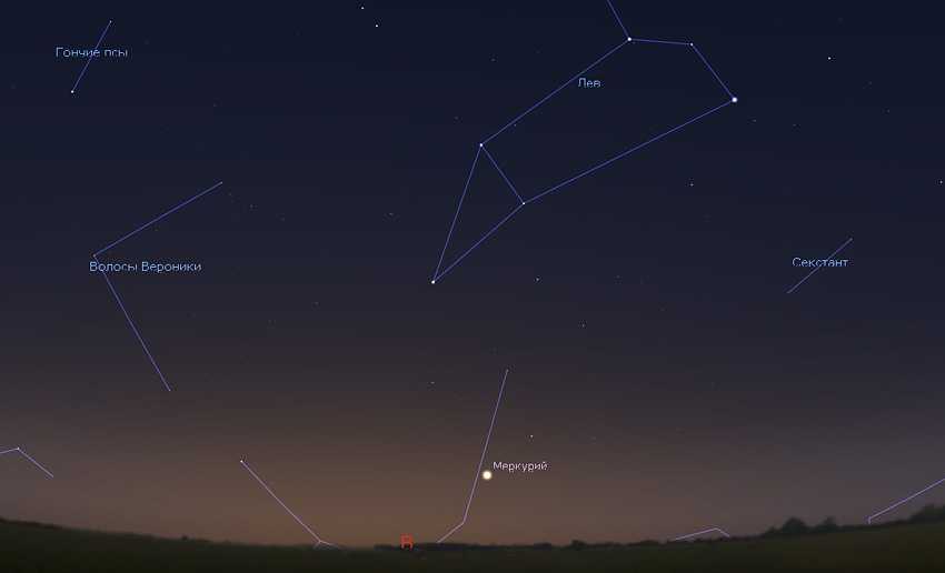 Как быть уверенным, что вы смотрите именно на Меркурий? Обратите внимание: выше Меркурия находится трапеция из четырех звезд. Это созвездие Льва